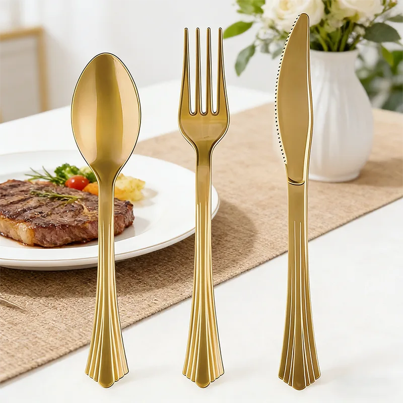 Se hai bisogno del listino prezzi delle posate in plastica Premium Fishtail, trova Ningbo Powerr Plastic Products Co., Ltd, che è una produzione professionale in Cina. Questo set nasconde la raffinatezza nei suoi dettagli. Le estremità delle posate presentano un esclusivo design convergente 3D a forma di ventaglio, con bordi lisci che formano un'elegante curvatura a coda di pesce per una presa comoda per il palmo e un aspetto scultoreo. Il rivestimento dorato uniforme crea sottili strati chiari e scuri, conferendo alla plastica una sostanziale sensazione simile al metallo, mentre le creste aggiungono sia decorazione che funzionalità antiscivolo, garantendo una presa salda anche con le mani unte. Spesso abbinato a tazze e piatti usa e getta dorati abbinati come set da festa, lo stile dorato unificato eleva l'impostazione della tavola. Ideale per feste in piscina, barbecue, matrimoni o eventi di team building, il suo design monouso offre praticità senza sacrificare l'eleganza, rendendo raffinatezza e praticità perfettamente compatibili.