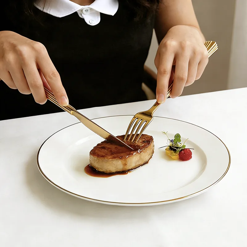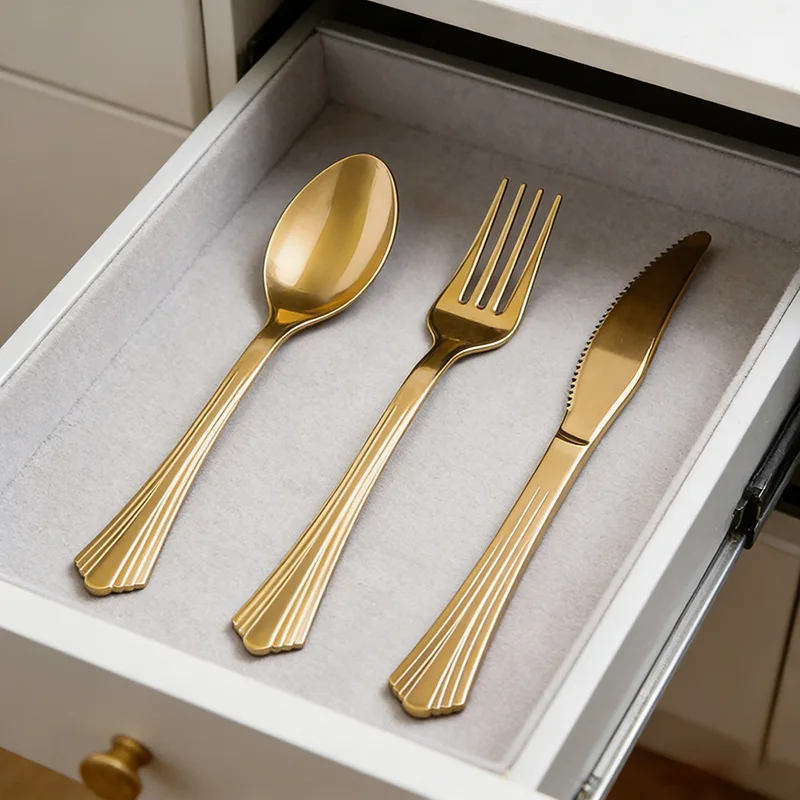 Il rivestimento dorato copre uniformemente ogni bordo, consentendo alle stoviglie di riflettere delicate gradazioni di chiaro e scuro sotto la luce. Permette al materiale plastico di presentare una consistenza sostanziale quanto quella delle stoviglie in metallo, eliminando completamente la sensazione di economicità.